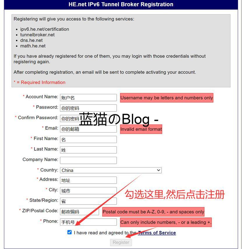 打开HE的IPv6隧道官网htttps://tunnelbroker.net/,点击register,注册一个账号