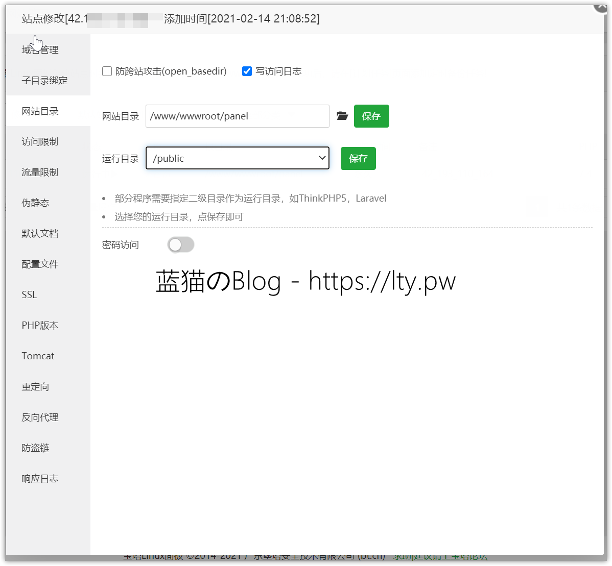 进入宝塔面板,运行目录设置为/public 建议关闭防跨站攻击