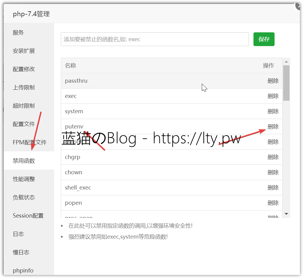 打开宝塔面板,管理PHP7.4,点击禁用函数,删除putenv proc_open shell_exec