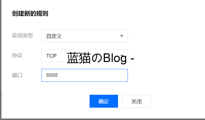 应用类型选择自定义 协议选择TCP 端口8888 然后点击确定