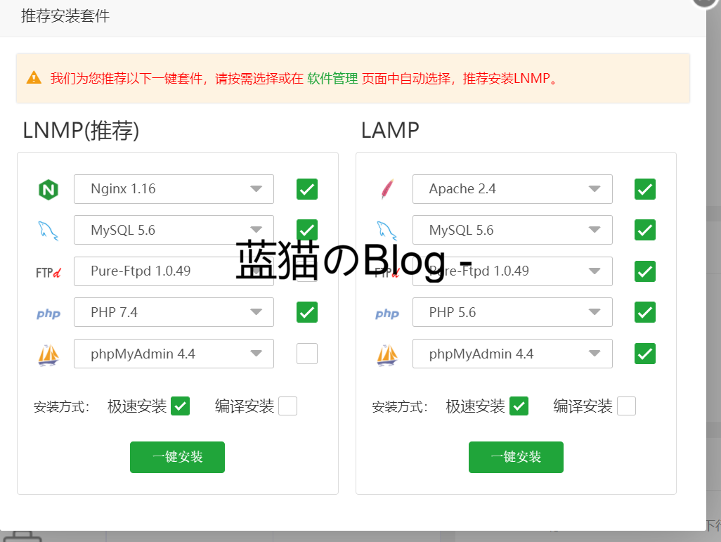 在弹出的窗口中按照下面的截图选择,然后点击左侧的一键安装(安装lnmp套件)选择完成后等待安装完毕